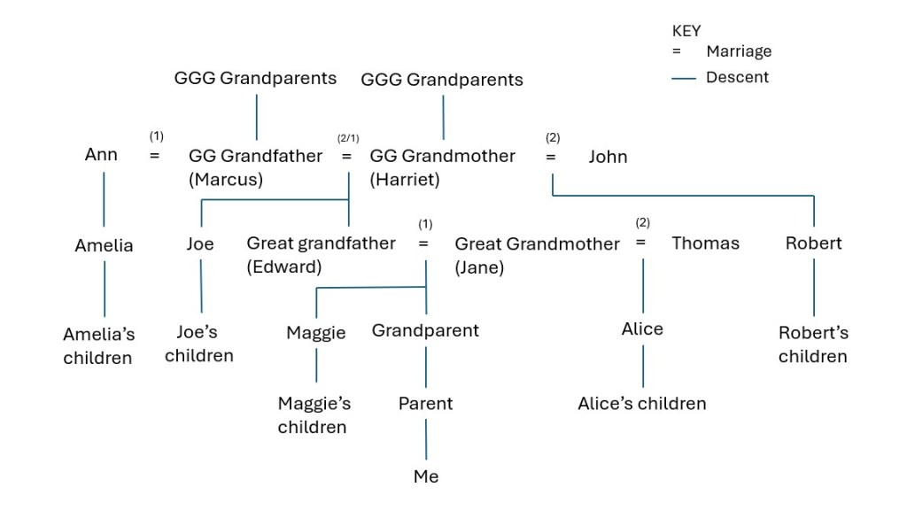 The point to emphasise here is that whether someone is your Half sibling, your Half aunt, your Half cousin or your Half 3rd cousin twice removed depends on what happened in your direct line at the point where you and your DNA match’s lines intersect. If your Most Recent Common Ancestors are a pair, your relationship will be a full sibling/ aunt/ cousin or 3rd cousin twice removed, etc. If your Most Recent Common Ancestor is just one person, your relationship will be ‘Half’.