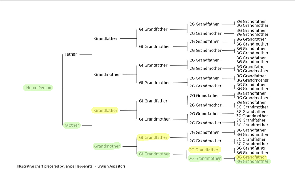 This package includes direct ancestors along your direct maternal line (mother, grandmother, great grandmother, GG grandmother, GGG grandmother, etc) plus all spouses of each (but not their parentage or ancestry) and all children born to each generation. In-depth research of the children of each marriage who are not direct ancestors will not be included, but baptisms, entries on censuses and any other information while they remain at the family home will be included. In the image below you’ll see who will be included.