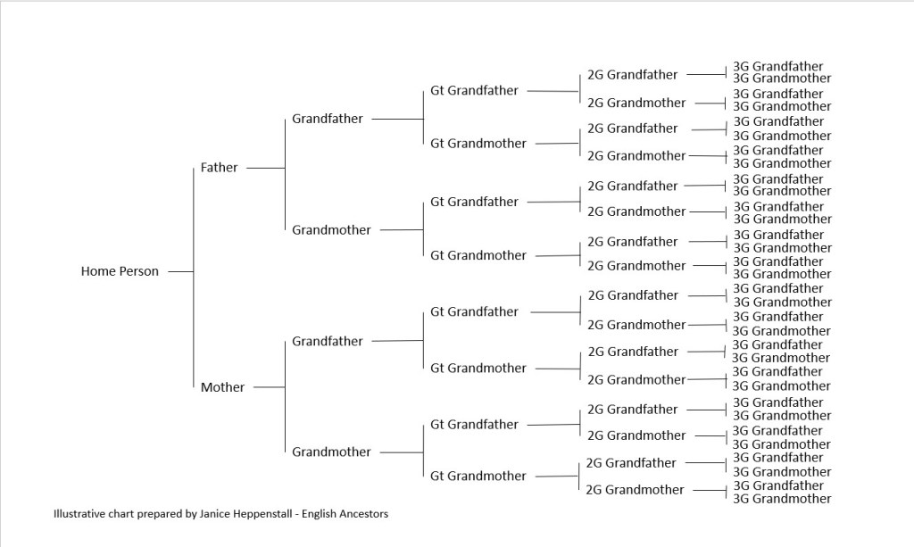 This package includes direct ancestors along all of your ancestral lines: both parents, four grandparents, eight great grandparents, sixteen GG grandparents, thirty-two GGG grandparents. The research includes all children born to each generation, but research of the children of each marriage who are not your direct ancestors will be limited to baptisms, entries on censuses and any other information while they remain at the family home.