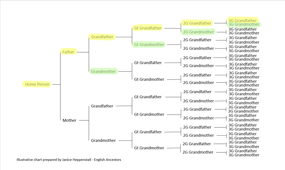 This package includes direct ancestors along one surname of your choice (parent, grandparent, great grandparent, GG grandparent, GGG grandparent, etc) plus all spouses of each (but not their parentage or ancestry) and all children born to each generation. In-depth research of the children of each marriage who are not direct ancestors will not be included, but baptisms, entries on censuses and any other information while they remain at the family home will be included. In the image below it is the mother’s surname that is to be researched – her father’s paternal line.
